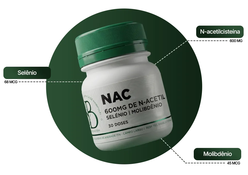 O NAC (N-acetilcisteína) age na raiz do problema e ajuda o fígado a se recuperar do estresse oxidativo, voltando a funcionar corretamente.